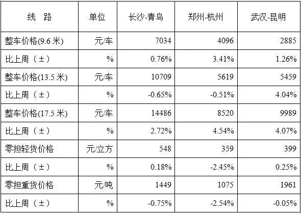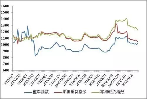 各车型指数环比涨跌不一,整车指数环比回升,零担指数环比回落。在零担指数中,零担轻货指数回落幅度高于零担重货指数。其中,整车指数为1027.54点,环比回升2.5%,比上年同期增长3.9%;零担轻货指数为1229.3点,环比回落1.47%;零担重货指数为1046.6点,环比回落1.23%。