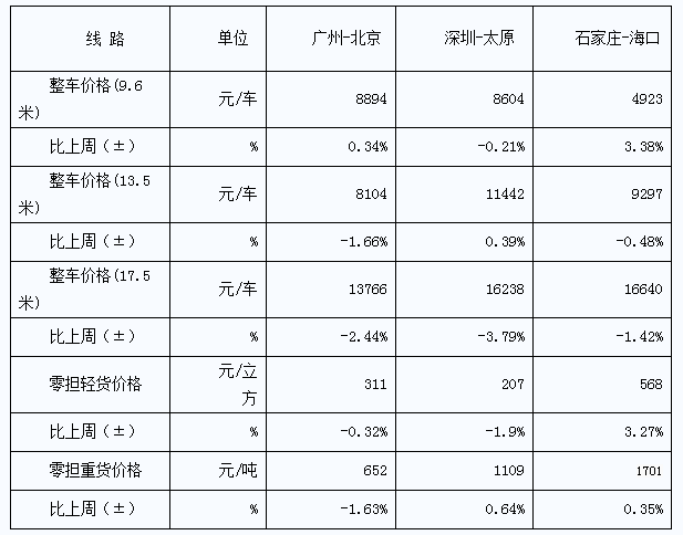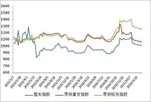 各车型指数环比均有不同程度回落,零担轻货指数回落幅度高于整车指数、零担重货指数。其中,整车指数为1002.7点,环比回落1.43%,但仍比上年同期增长9.17%;零担轻货指数为1247.7 点,环比回落1.53%;零担重货指数为1059.6点,环比回落1.16%。